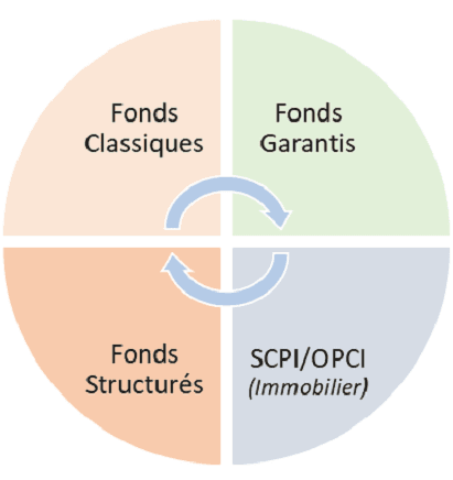 Il existe 4 grandes familles de supports financiers. Le pourcentage alloué sur chacune d'elle dépendra de vos objectifs et de votre tolérance au risque.